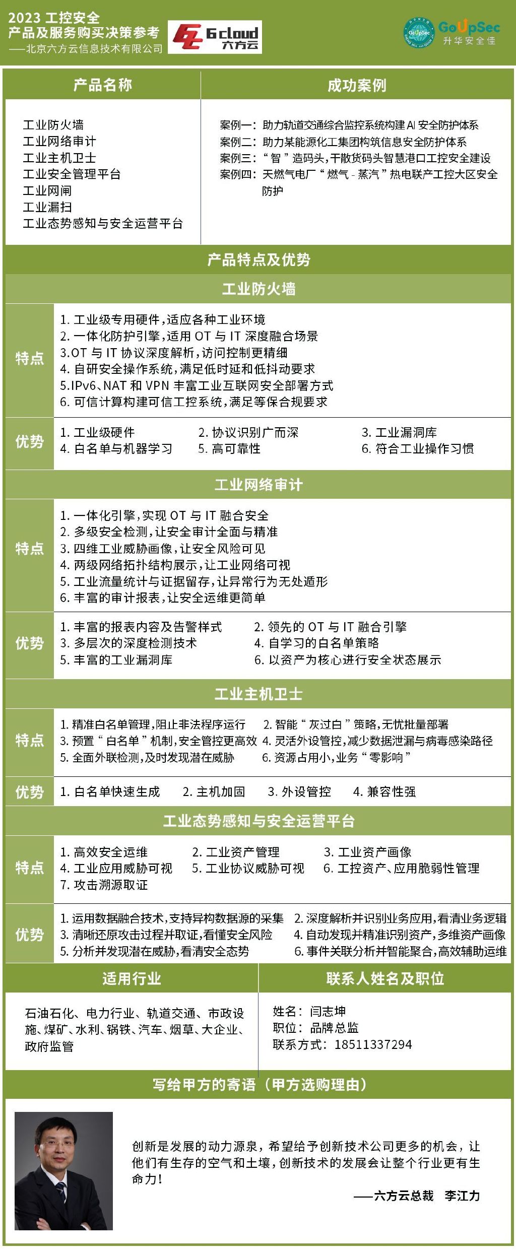 入选《工控安全产品及服务购买决策参考》是业界权威机构对六方云工控安全硬实力的认可与支持,六方云高度重视工业控制系统的网络安全防护工作,依托于多年工业互联网安全与关键信息基础设施保护领域的实战经验,以全面化、体系化的安全产品为核心,以整体化、定制化的解决方案为抓手,基于工业企业的复杂安全需求,提供全过程、全天候、全方位的精准化安全服务,为用户构建覆盖工业行业全生命周期的安全保障体系,确保工业互联网企业安全稳定运营。