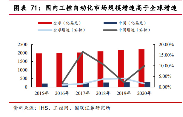 我们认为工控设备公司将受益于整个行业的景气度提升,2021 年汇川技术、禾 川技术、伟创电气、雷赛智能、英威腾等营收增速均高于 20%。根据 HIS 和工控网 数据统计,中国工控自动化设备占全球 12%-14%左右,具有很大的成长空间。国内 工控自动化行业 2015-2020 年复合增长率为 8.09%,高于全球增速 2.35%,加之下 游新兴领域需求旺盛和国产替代,内资品牌增速领跑全球。