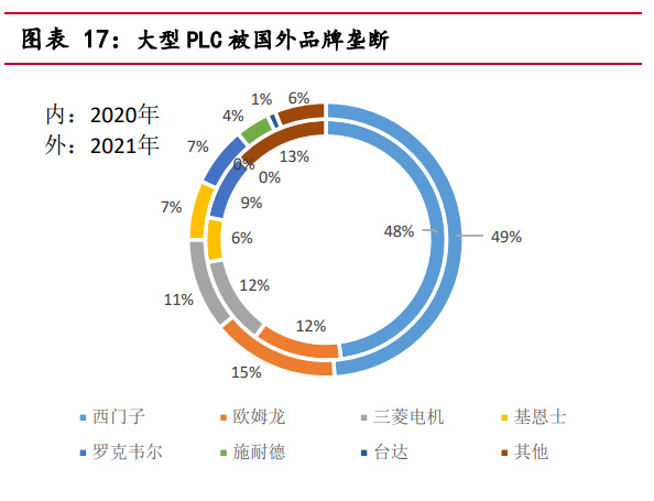 从市场结构来看,根据华经产业研究院统计数据,我国中大型 PLC 和小型 PLC 大致平分市场,2021 年市场份额均占比分别为 50.19%和 49.81%。