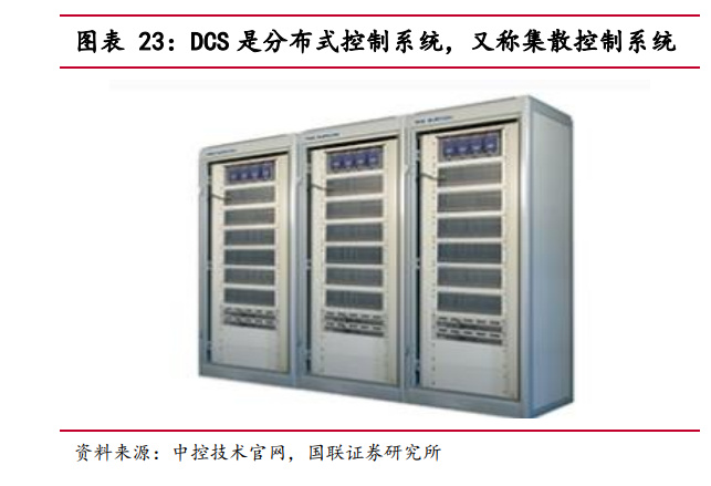 DCS(Distributed Control System)即集散控制系统,由输入输出模块、通信 模块、控制器和人机界面组成,用于实现对生产过程的数据采集、控制和监视功能。 其主要特点是分散控制、集中操作。 DCS 主要应用于化工、石化、电力、核电、制 药、冶金。