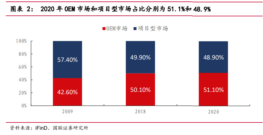 工控设备下游行业可分为 OEM 型市场和项目型市场,二者占比各 50%左右, 且 OEM 市场占比在逐年提升。OEM 市场多以设备的批量供应为主,少数会提供解 决方案;项目型市场是指工程整体自动化解决方案的设计与实施。2009、2018、2020 年OEM型市场和项目型市场份额分别为42.6%/57.4%、50.1%/49.9%、51.1%/48.9%, OEM 型市场份额不断提升且超过了项目型市场份额。