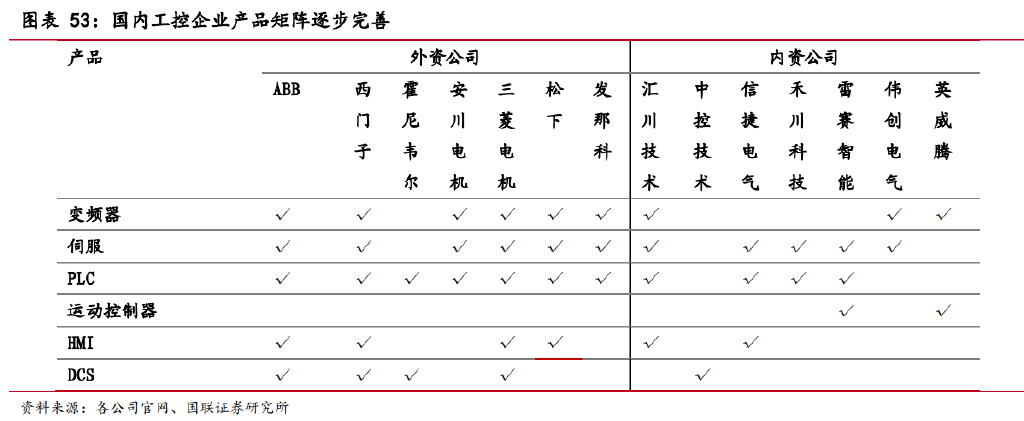 产品完善:国内工控企业由单产品拓展至多产品,产品矩阵逐渐完善且产品性能 在绝大多数场景均能满足客户要求,且初步具备解决方案的能力,加之国内厂商服务 优于国外,故我们认为目前国内工控企业能够在众多领域实现国产替代。根据工控网, 在全球范围内,西门子、三菱、ABB 工控产品覆盖最广,日系厂商偏向于伺服和电机 等精密系统,应用于离散自动化。德系厂商偏向于大型控制系统和大功率驱动系统, 流程自动化和离散自动化均有覆盖。国内厂商起步较晚,正在从单产品发展至多产品, 在 DCS、变频器、中小型 PLC、伺服,以及在新的专用领域(光伏、锂电设备)积 累较多,初步具备解决方案能力。