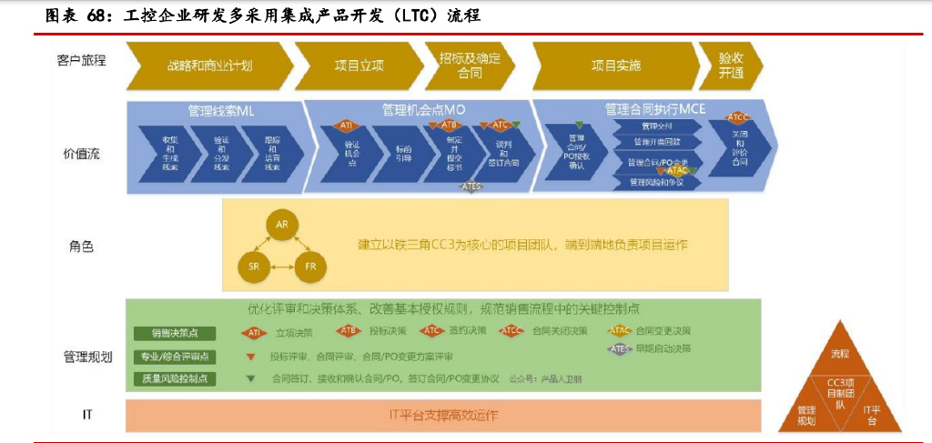 在研发流程方面,由于工控产品多为硬件产品和项目型产品,故适合采用集成产 品开发(IPD)流程,加快产品研发效率,提供产品质量,降低研发成本。采用 IPD 流程的典型代表企业为汇川技术、禾川科技、伟创电气、雷赛智能。微观的 IPD 是指 产品集成开发流程;中观的 IPD 是指包括 PDP、市场管理和产品规划及需求管理过程的产品创新管理体系;宏观的 IPD 是指端到端的产品管理。