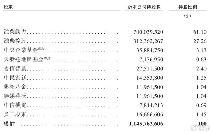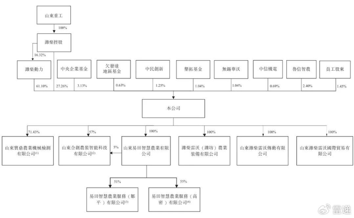 IPO前,潍柴雷沃分别由潍柴动力和潍柴控股直接持有约61.10%和27.26%的股权。潍柴动力由潍柴控股持有约16.32%股权,而潍柴控股则由山东重工全资拥有。由于潍柴动力是潍柴控股的综合附属公司,且潍柴控股能够对潍柴动力的股东大会施加重大影响。