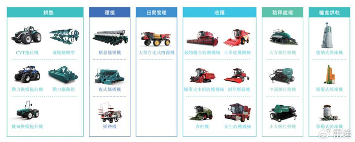 1,成套智能农机装备,涵盖拖拉机、收获机械和农机具,覆盖从耕整、种植、田间管理、收获、秸秆处理与粮食烘干等现代农业生产的各个环节,重点聚焦高端化、智能化农机装备,助力解决「谁来种地」问题;