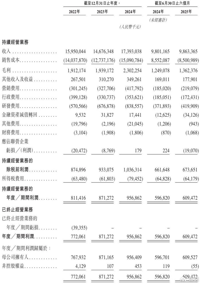 招股书显示,潍柴雷沃2022年、2023年、2024年持续经营业务收入分别为159.5亿元、146.76亿元、173.93亿元;毛利分别为19亿元、19.39亿元、23亿元;持续经营业务的年度利润分别为8.11亿、8.71亿、9.57亿;年度利润分别为7.72亿元、8.71亿元、9.57亿元。